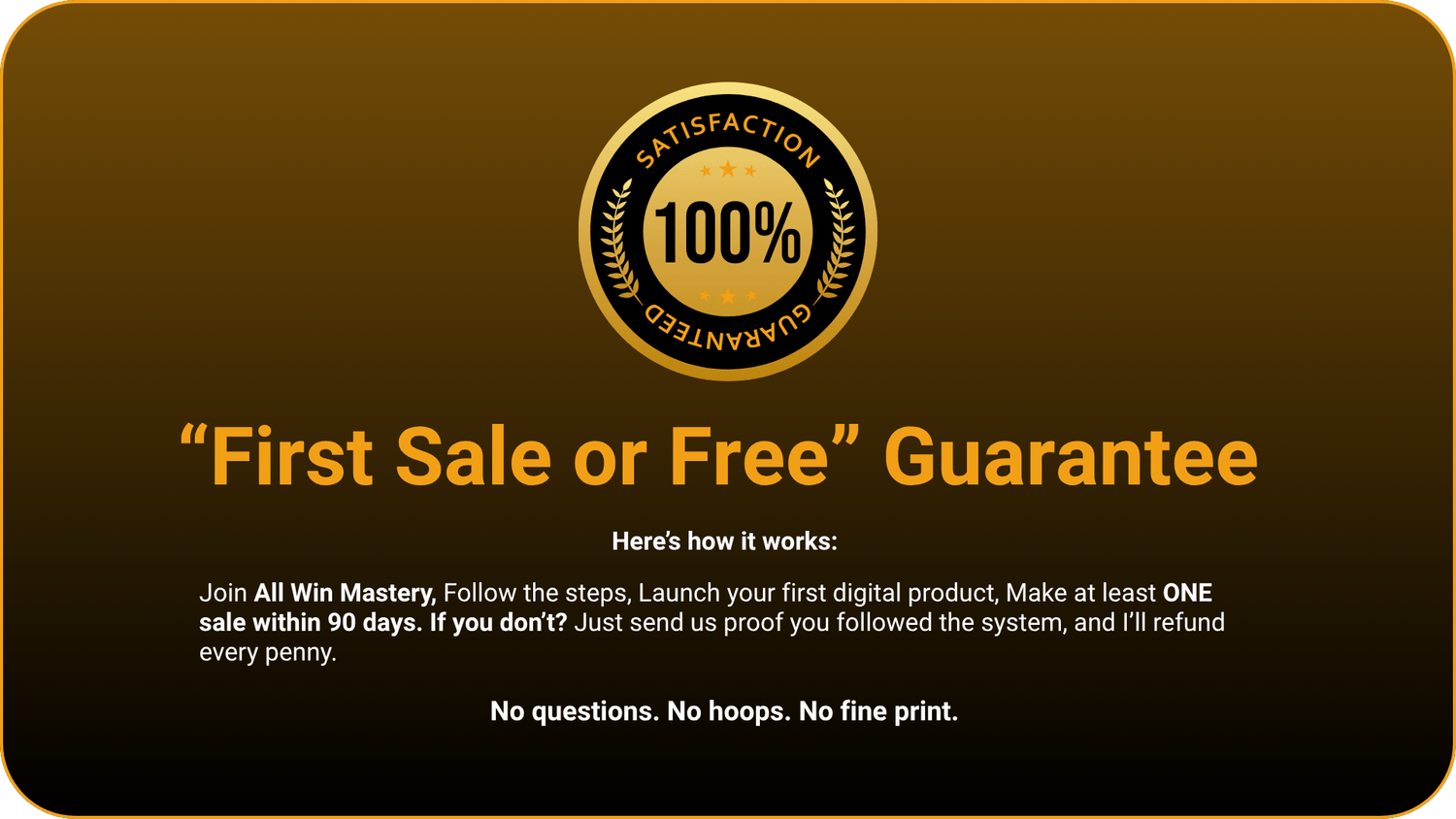 If you don't hit your first sale within 90 days with your Digital Product, we'll personally coach you until you do. No hidden conditions.